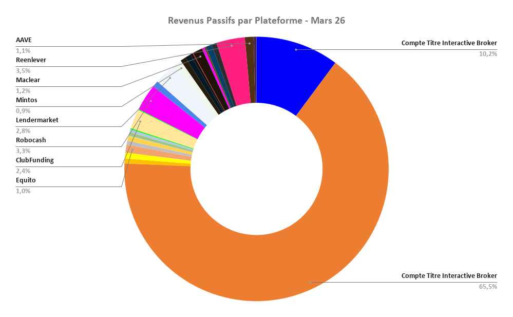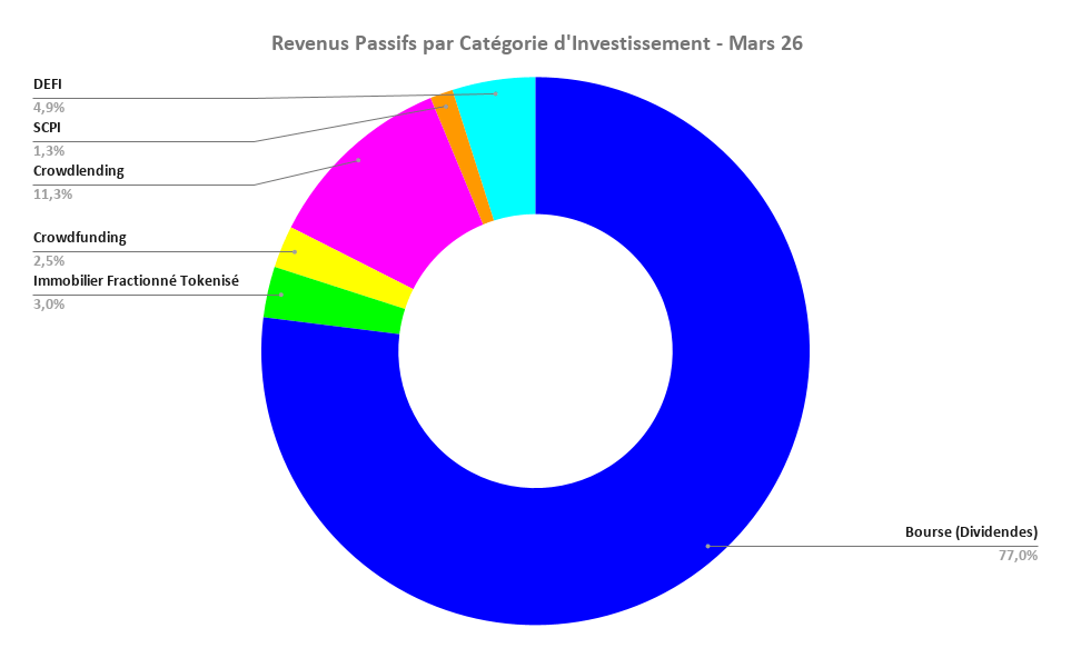 Les revenus passifs générés en Mars s’élèvent à 1935.70€ (2234$), soit un rendement de 6.1% annualisé (Sur la partie qui génère des Revenus Passifs).